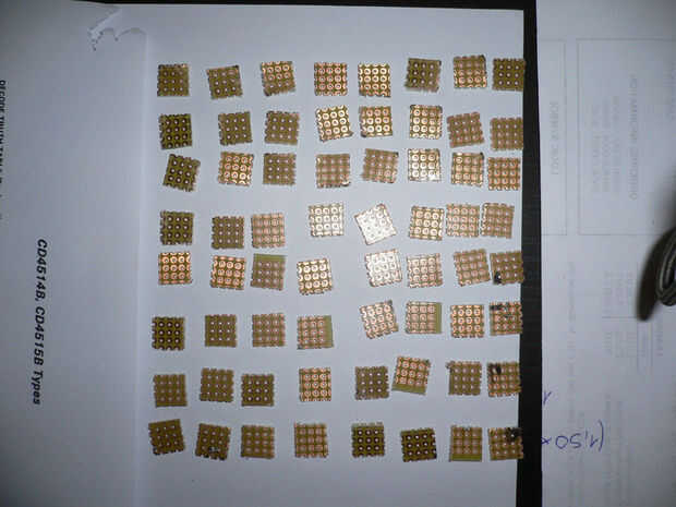 Tagliamo una basetta millefiori Faccendo 64 quadretti di 3 x 3 fori. Serviranno por fissare i terminali delle colonne e dei livelli alla tavoletta.