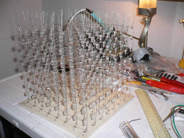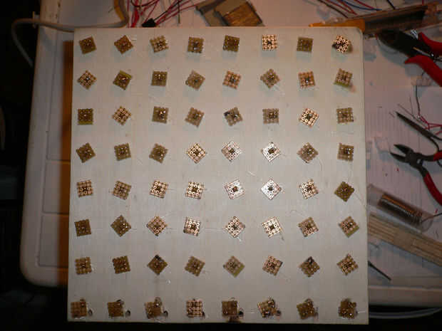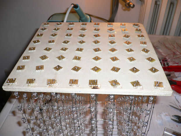 Poggiate il primo livello del cubo (quello dovra' stare en alto) sulla tavoletta en corrispondenza dei fori. Saldate tutti e 64 me produc fili precedenza agli altrettanti anodi (+) dei llevó avete posto tavoletta sulla. Una volta finito inserite dall'alto la griglia successiva e continuate a saldare.