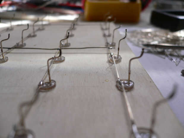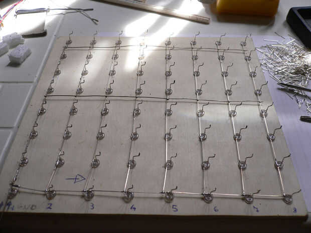 Una volta avete fissato tutti i 64 quadretti saldate tutti i fili alla basetta millefiori e tagliate con la tronchesina il filo en eccesso. En este modo sara' saldare molto facile vari fili di o ad ogni e de anodo catodo.