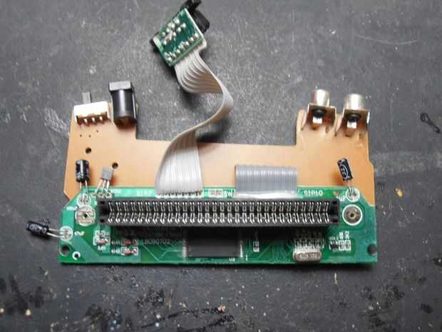 Inspección de la PCB principal muestra algo bueno y una broma. Lo bueno fue que el cable de cinta de la Junta del conector y la placa principal fue etiquetado en la pantalla de seda, por lo que no tengo que adivinar o trazar cual cable va donde. La broma fue el regulador de potencia, sólo un transistor y un diodo de zener poco minúsculo en su base.