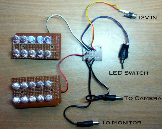 En pocas palabras, la electrónica es todo encendida de un pequeño tablero principal que tiene corriente de 12V a través de él y conectar la cámara, pantalla y LED tableros a él. Las resistencias se utilizan para reducir los 12V a acerca de 3V para el LED (producen un poco de calor, resistencias de potencia nominal mayor de uso).