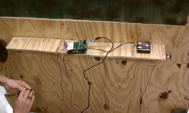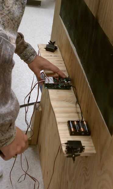 El Boe Bot y servos montados en la parte posterior de la pared con velcro.