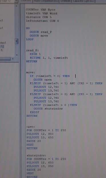 Ahora es el momento de escribir código. El código se corrió para el Boe Bot. Cuando el sensor detecta que el cambio, la ventana se abre hasta que golpea el tornillo. Lo mismo sucede cuando es el momento de cerrarla.
