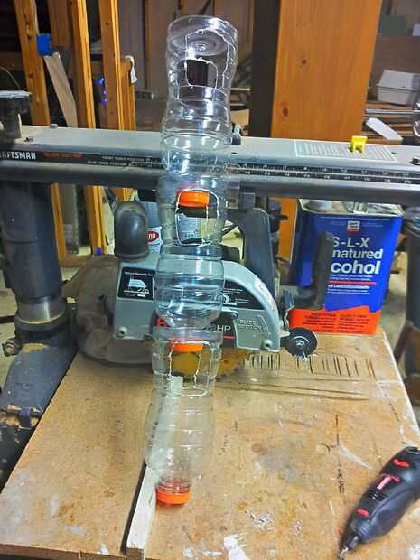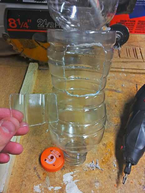 Tendrá que cortar un agujero en la base de todas las botellas excepto la superior. Hacer el agujero pequeño y poco a poco trabajar más y más hasta la parte superior de la botella siguiente se ajusta en el orificio de la base de la botella por debajo de ella. No quiere demasiado grande como la tapa de la botella superior debe levantar la botella inferior.