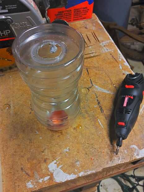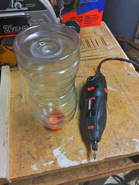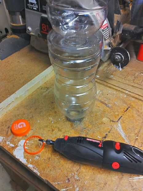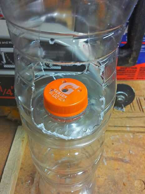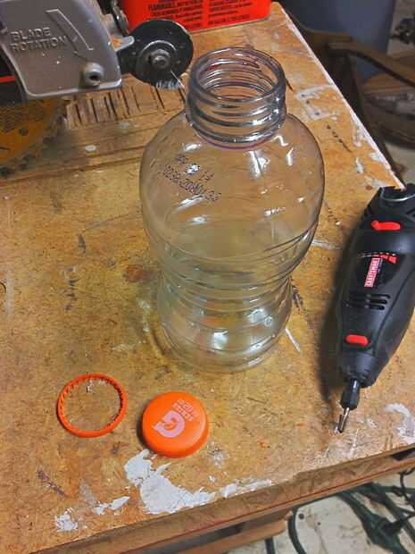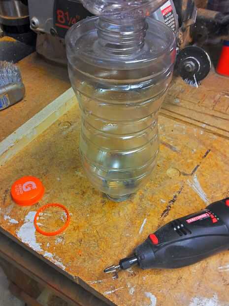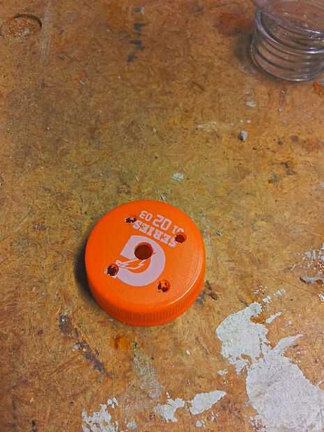 A continuación necesitará cortar agujeros en las tapas de las botellas Gatoraide para permitir que el tubo de aire para ejecutarse desde la parte inferior de la Asamblea en la parte superior. También he añadido 4 agujeros de drenaje a cada una de las tapas aunque es probable que no necesite como el tubo de aire completamente no selle el orificio de que se ejecuta a través.