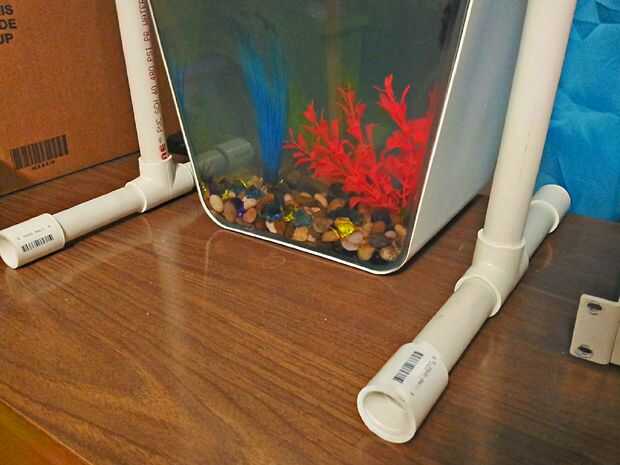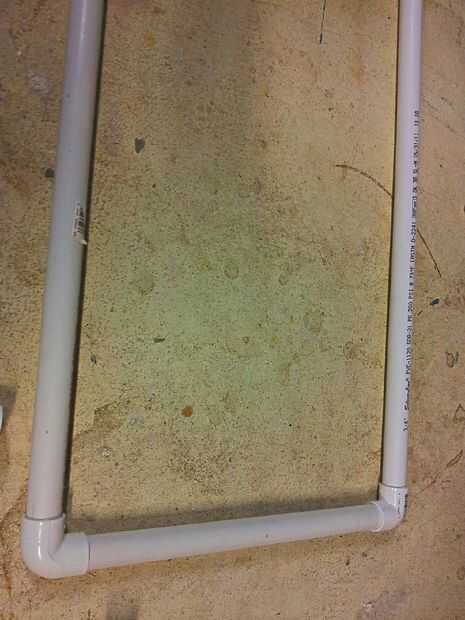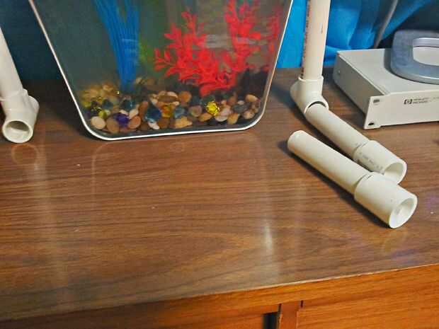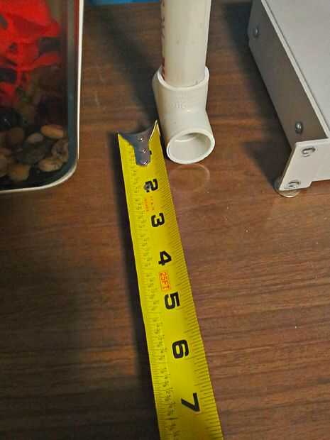 Había estimado los postes verticales de la tubería de PVC primero con una cinta métrica sujetando mi Gatoraide botella montaje encima de mi pecera. Salieron a 43" así que corte dos longitudes del tubo de PVC. Luego medidos a través de la pecera y hecho de un tubo de 14" a la barra superior. Ensambladas las tres piezas con los dos conectores de T en la base y las articulaciones del codo en la parte superior y la sostuvo hasta mi pecera para medir cuánto deben ser los pies. I vino para arriba con segmentos de 5" para éstos y adjunta a cada lado del conector T y luego al recto a través del conector para hacer el nivel de ensamblado. Si no estás usando el mismo tamaño de pecera como yo, probablemente deberás ajustar estas mediciones para ajustar su unidad de tanque y botella.