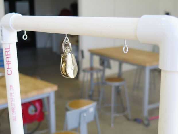 En la viga transversal superior, vas a agregar dos ganchos de ojo (para soporte de la barra de la burbuja) y una polea en el centro poner una cadena a través de para elevarlo. Mide una pulgada en cada lado de dos de los ganchos de ojo y poner la polea en un gancho de ojo en el medio.