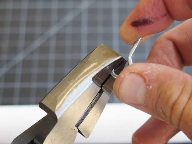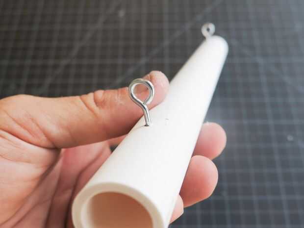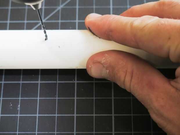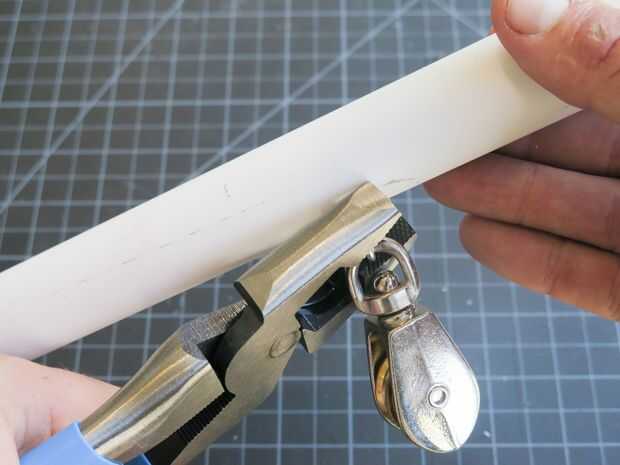 Para cada gancho del ojo, utilice una broca de taladro pequeño un agujero en el PVC y use sus manos para torcerlo todo el camino. Puede abrir un gancho de ojo con un par de pinzas para subirse la polea y doblarla luego a cerradas.