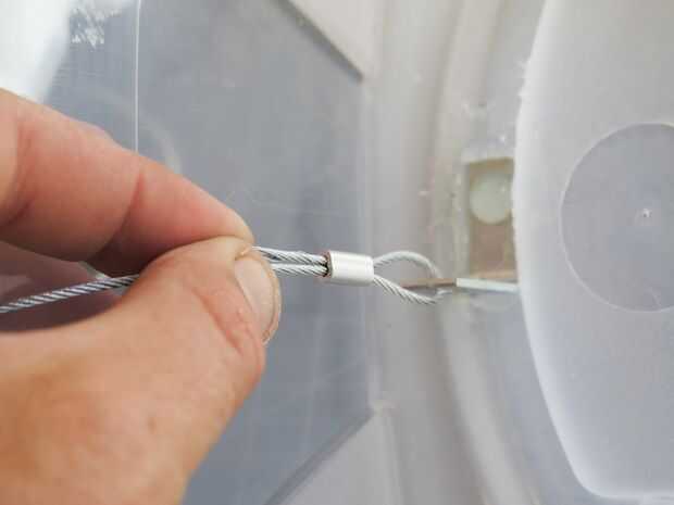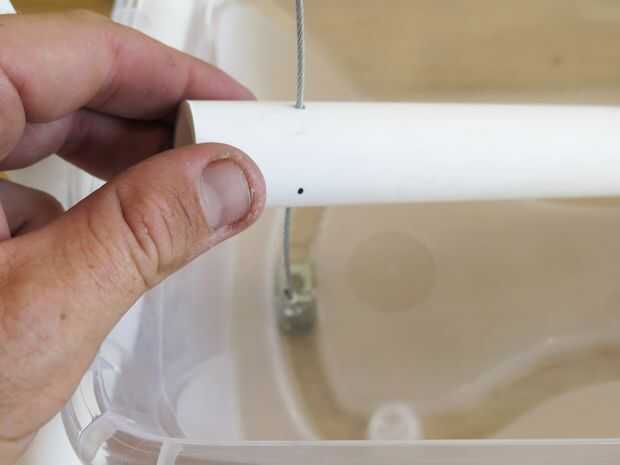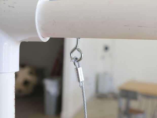 "Virolas" son el nombre de estos soportes de alambre pequeño. Añadir una férula en un lado del alambre y lazo a través del L soporte sobre la bañera. Cuando usted tiene en su lugar, doble juntos para no ir en cualquier lugar. Luego alambre de la barra de la burbuja, asegurándose de que el gancho del ojo en la barra es hacia arriba. Luego conecte el cable en el gancho del ojo superior, asegurándose de que el cable es relativamente enseñó.