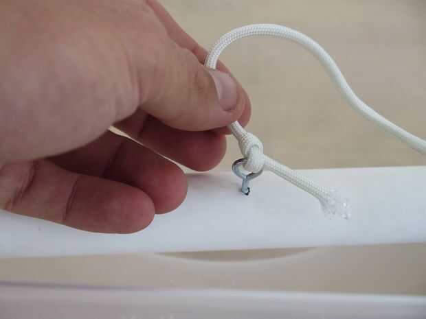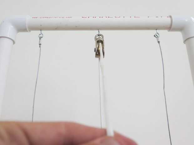 Utilicé hilo de nylon, pero puede usar lo que tengas alrededor. Lazo del gancho de ojo en la barra de la burbuja y alimentarse a través de la polea de la viga transversal. Si lo desea, puede añadir peso al final o haga algunos nudos como un pequeño mango para más adelante.