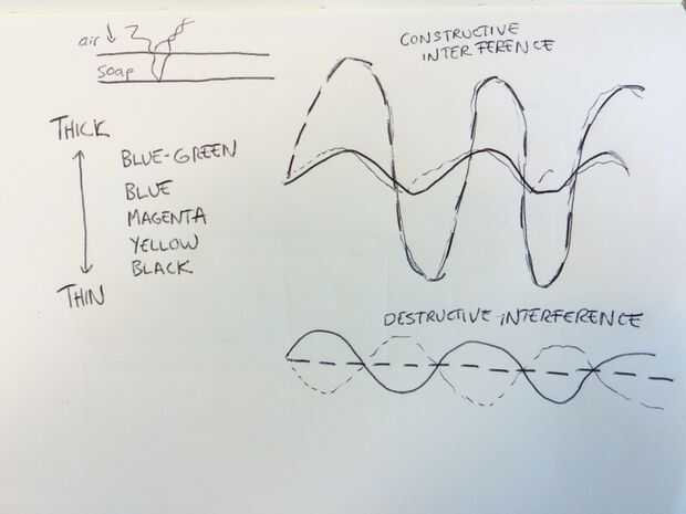Cuando luz entra en la película de jabón, algo de él consigue reflejada inmediatamente y pasa a través y refleja solamente después de su golpe el borde posterior (vea el dibujo). La onda que se refleja en el borde posterior ha ido una poco más lejos y cambió dirección un poco y así puede ser sincronizada con otra onda de la luz. Dependiendo de cómo alinean, puede añadir a la magnitud de las ondas del otro (interferencia constructiva) o neutralizar mutuamente (interferencia destructiva).