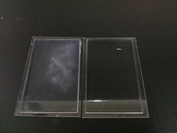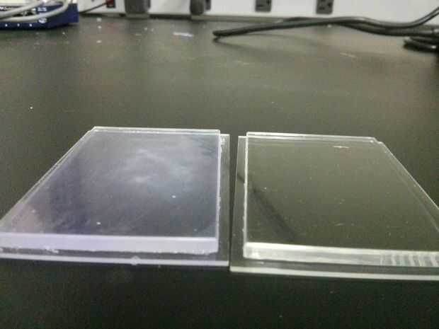Uno de los principales pain points para uso de impresoras de SLA y DLP es que la transmisión óptica de las ventanas PDMS cambian con el tiempo. Este "nubosidad" o "empaña" es muy claro a simple vista, como las dos fotos de un windows usado al lado de un nuevo programa de una. Hay dos causas para la opacidad. En primer lugar, las especies absorbentes de UV en la resina empapen en el PDMS, disminuyendo su transmisión en el tiempo. En algunas resinas esto aparece como un resplandor blanco pálido sobre la ventana entera debido a la fluorescencia del bloqueador de UV. Esto es particularmente obvio en la foto izquierda ángulo inferior. En resinas como Autodesk estándar claro, la absorción de resinas por el PDMS es pequeña, y la cantidad de bloqueador de UV absorbe aún más pequeña. Sin embargo, esta pequeña cantidad es todavía suficiente para reducir considerablemente la transmisión óptica. Este proceso dura semanas y en última instancia, reduce la transmisión de un 90% a ~ 65% incluso cuando no se utilizan para la impresión.