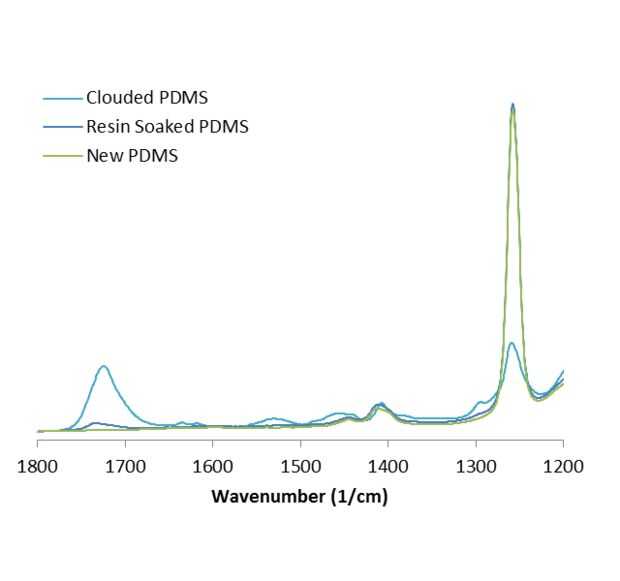 Espectroscopia de infrarrojo de transformación de Fourier (FTIR) es una técnicas analíticas que sobresale en la identificación de la composición química de un material. Atenúa la reflexión total (ATR)-FTIR es variante particularmente útil ya que solo muestras el primer par de micras en una muestra. El espectro FTIR de una ventana Virgen está dominado inicialmente por el gran estiramiento simétrico de los grupos metilo en el PDMS en 1250 1/cm. Después, la resina se hincha en el PDMS en las zonas sin imprimir de la ventana de un pico muy débil de los grupos carbonilo de la resina es evidente en 1720 1/cm. Esto implica que una cantidad pequeña de resina está presente en las partes sin imprimir de la ventana. Sin embargo, en la parte impresa de la ventana de la cima de la resina es ahora comparable en tamaño a la cima de PDMS. Esto sugiere que la composición de la ventana en la superficie ahora incluye una cantidad sustancial de polímero de la resina además de PDMS.