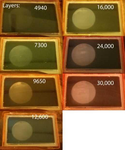 A pesar de la baja calidad de las fotos se puede deducir un aumento gradual en la opacidad y heterogenatity de la ventana. En capas de 30K varios tipos de daños son evidentes a simple vista.