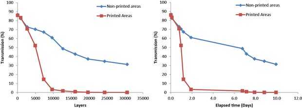 El UV-Vis confirma el rápido aumento de la opacidad que visualmente se observa en las áreas que se utiliza para la impresión. Este enfoque es mucho más sensible que observaciones visuales, como el la transmisión disminuye de 85% a menos del 5% por 10 K capa; sin embargo, esta sensibilidad también elimina cualquier idea a cambios anteriores capas de 10 K. Un inconveniente adicional de este método es que se centra el punto tamaño, mientras que se han observado los resultados nubosidad a ser heterogénea en toda la imprime área. Un mejor enfoque para el trabajo futuro puede usar una fuente de luz con un tamaño de spot más amplio y un radiómetro ubicado cerca de la ventana.