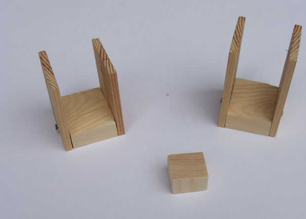 Ahora crearemos los dos soportes en forma de U, que luego cada uno tendrá un LED y una célula fotoconductora. Visto rectángulos dos de 30 x 40 mm fuera de la misma pieza de madera utilizada para la Plaza. Luego tomar unas maderas más finas (5 mm de espesor) y cortar cuatro rectángulos del mismo. La longitud de éstos depende de la distancia entre el orificio del anillo y los lados del marco, que se ha medido anteriormente. Tenga en cuenta que la distancia a la izquierda y al fondo puede diferir. Para cualquier lado necesitas dos rectángulos, así cuatro rectángulos en conjunto. Añadir unos 10 mm para estas medidas y tomar esto como la longitud del rectángulo. El ancho del rectángulo debe ser de 40 mm, según la anchura del rectángulo grueso.
