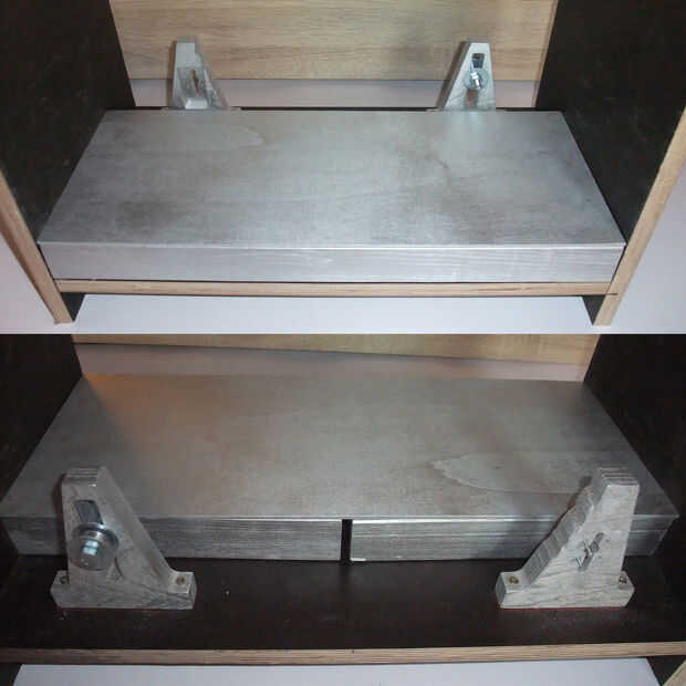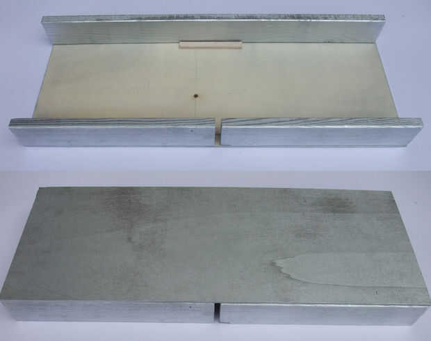 Se adhieren los maderos cuadrados 5 mm x 10 mm en el centro y en sitios opuestos a los bordes largos de la madera dejando 15 mm (ancho de las maderas cuadradas más grandes) hasta el borde. Estos evitará la caída de los grandes maderos cuadrados cuando se utiliza como cobertura de la madera contrachapada.