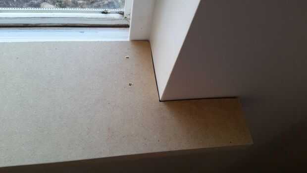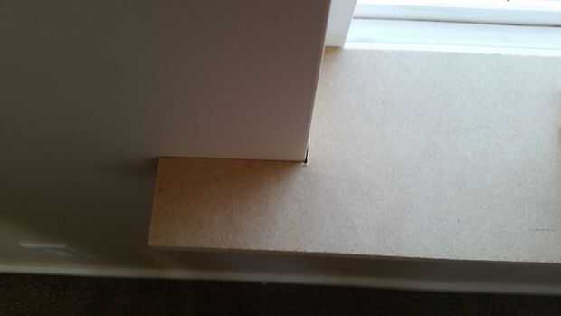 Con la sierra caladora, cortar los dos cuadrados de cada extremo y en el alféizar de la ventana de prueba. Si todo se ve bien, de arena y clavos en su lugar.
