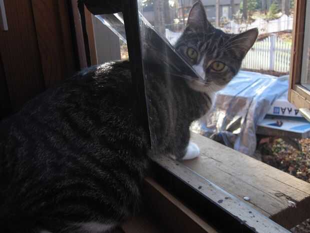 2 después de cortar la entrada especificada para su gato de tamaño, excepto el recorte para recortar y montar como la aleta oscilante, también elegí cinta adhesiva para asegurar el columpio. Juntas incluidas fabricado con cinta adhesiva.