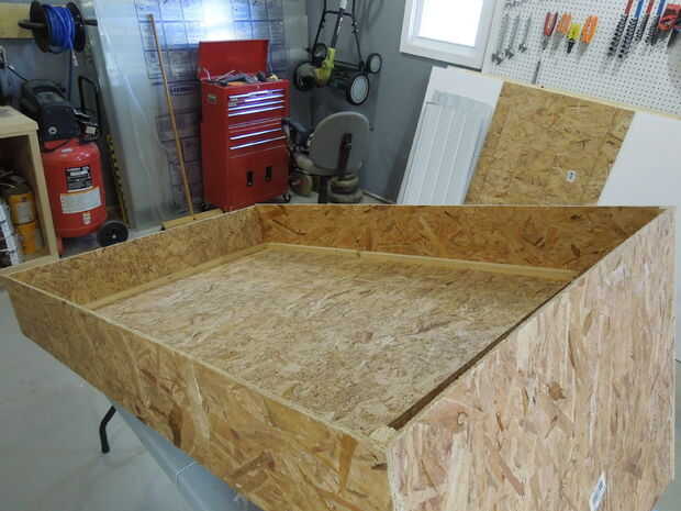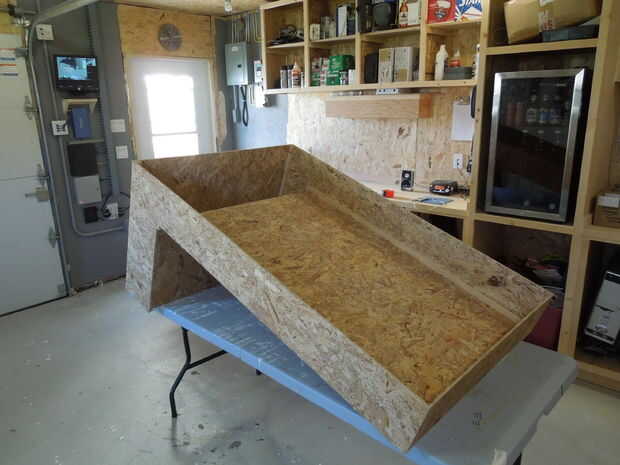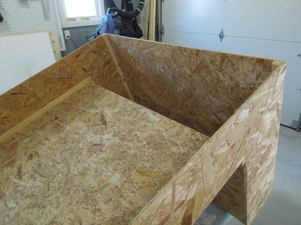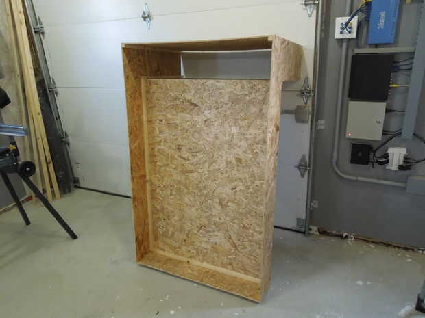 Las dos "L" en forma de partes del colector se cortan de OSB en una sola pieza. Esto es muy importante. Si los lados del colector fueron cortados de dos piezas no habría nada para mantenerse en forma y se pliegue como un libro tan pronto como se levantó.