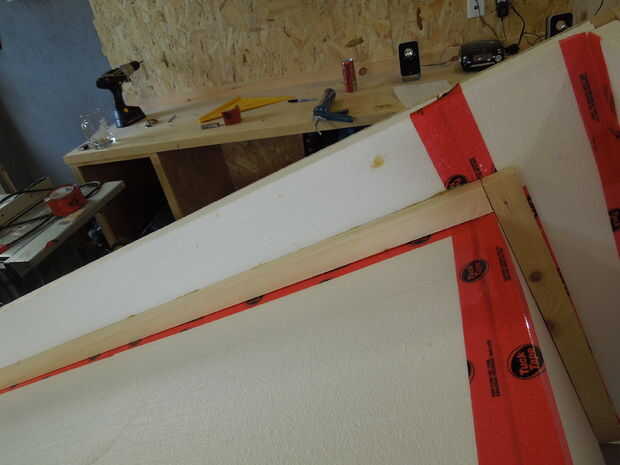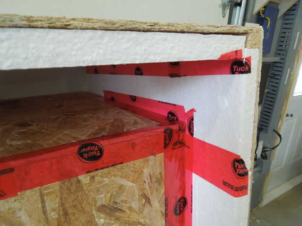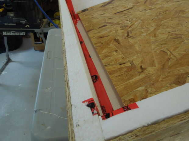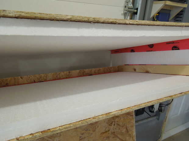 El divisor consiste en OSB de 1/4 '' con un espaciador a cada lado. El espaciador hizo rasgar abajo tablero de 1 por 6 a 1 1/2 '' por las tiras de 3/4 ''. Las tiras eran pegadas con pegamento de cartón pluma para el aislamiento y luego aseguradas con 2'' 16 calibre clavos del clavito en un disparo de la cáscara exterior. A lo largo de ambos lados del colector y deje de 1 1/2 pulgadas desde la parte inferior.