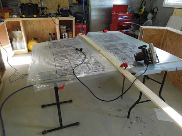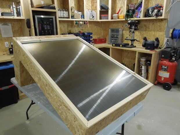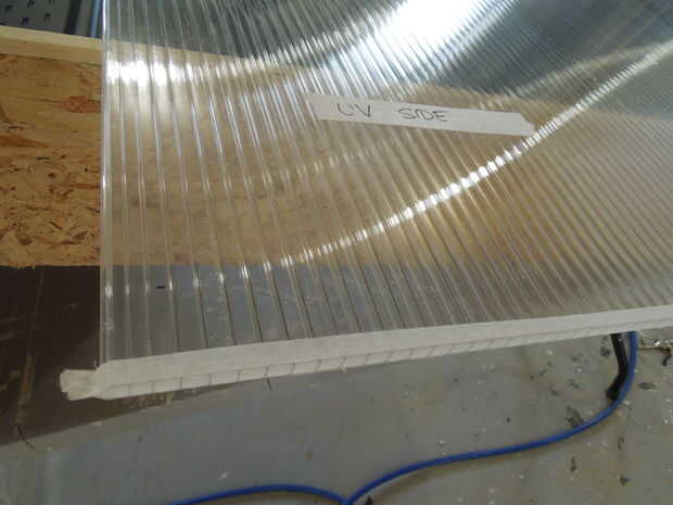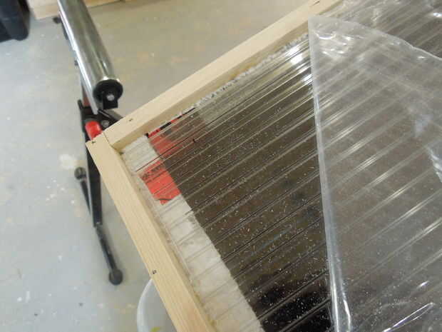 El acristalamiento se cortó con mi sierra circular con una cuchilla de corte especial «panel de plástico". Se fue cortado 1/4 '' por 1/4 '' más pequeña que la abertura del marco para permitir la expansión térmica. Durante el corte, es una buena idea para dejar la película de plástico en ambos lados, con el fin de evitar la formación de rebabas. Asegúrese de que se corta para que las células están orientadas verticalmente. Hay uno solo que puede estar mirando los rayos del sol. Generalmente está marcada por la película de plástico que la cubre. Después de cortar, pelar una esquina de la película en el lado de protección UV, marque el panel con un trozo de cinta adhesiva y retire el resto de la película.