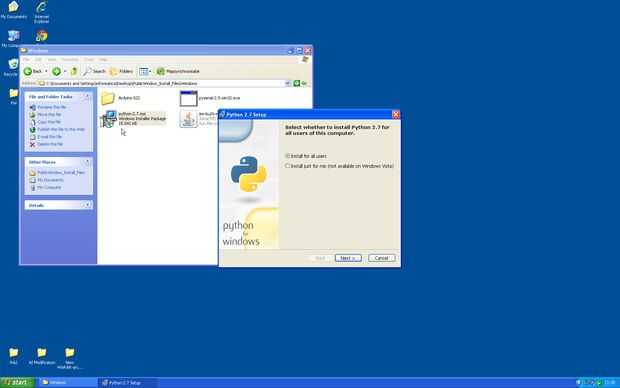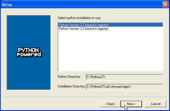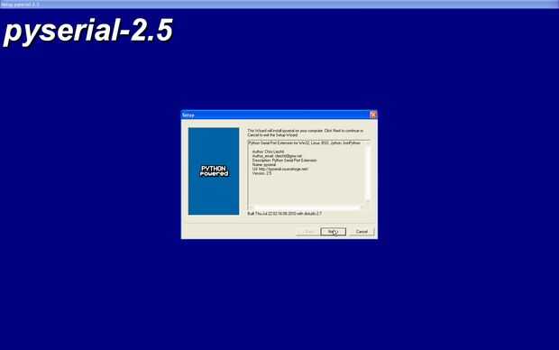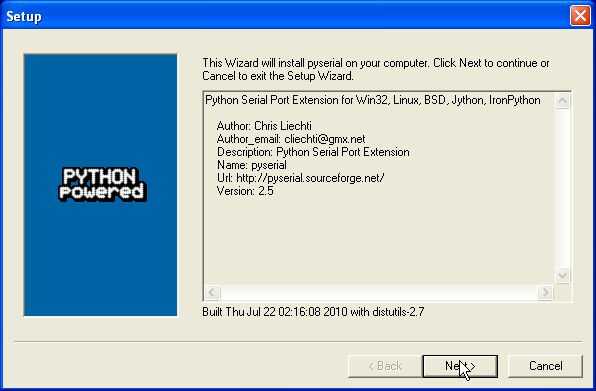 2. Instale pitones serie, ejecutar pyserial-2.5.win32.exe, seleccione Python versión 2.7 cuando se le pida para "instalación de python para usar:"