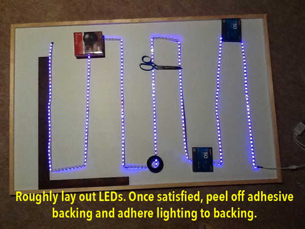 RECORDATORIO Nota: Se puede ver en la por debajo de la foto que dobla mi cinta de LED en ángulos de 90 grados bastante fuerte. Como mi iluminación ha sido errática desde poco después de que este proyecto fue fotografiado, creo que eso es lo que puedo haber hecho mal. TAAAN--por favor no doble su iluminación esta manera--en su lugar, utilice una solución más curva o utilice luces baratas de la secuencia de Navidad!!!! Estoy seguro voy eventualmente volver atrás y cambiar de mina hacia fuera!