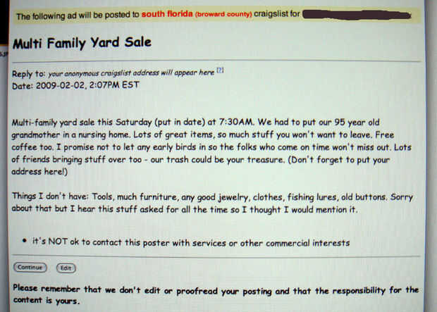 Así, en su anuncio en la lista de Craig puede conseguir todo palabrería y hablar sobre tu café, tu abuela y tus amigos que traen cosas. Las palabras mágicas son: venta, coleccionables, venta de inmuebles, multifamiliares, viejas cosas, toneladas de materia en movimiento. Las palabras que va ahuyentar a la mayoría de la gente son: artículos para bebé, apartamento (Cuántas cosas podía tener?), su número de teléfono, diseño de marca cualquiera que sea, ropa de tamaño 24.