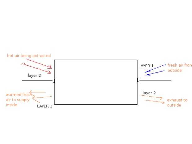 Usted necesita decidir cual es la extracción y que es su fuente. Así que vamos a elegir que 1 compartimento es el suministro de aire fresco del exterior. El ventilador en el compartimiento 1 superior izquierda aspira aire y fuerzas a través del intercambiador de calor en la cubeta 2 en la parte inferior derecha del cuadro. El tubo de 5" de la parte posterior del compartimiento 2 va a los conductos de alimentación en la casa y proporciona aire fresco calentado a los dormitorios y salones.