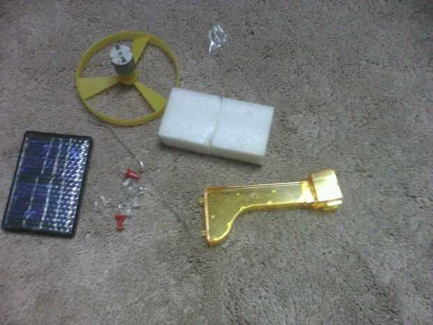 un pequeño ventilador, impulsado por un motor de hobby. Funciona con 2 AA pilas recargables. Las baterías son conectadas a un panel solar, que recarga durante el día.El circuito se enciende mediante una célula de CdS (interruptor) que significa el ve