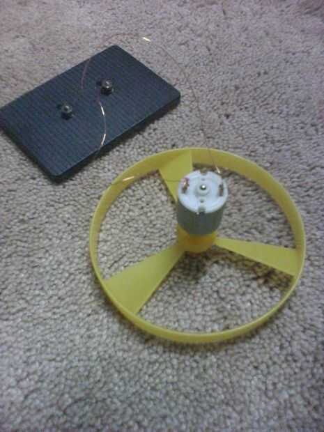 un pequeño ventilador, impulsado por un motor de hobby. Funciona con 2 AA pilas recargables. Las baterías son conectadas a un panel solar, que recarga durante el día.El circuito se enciende mediante una célula de CdS (interruptor) que significa el ve