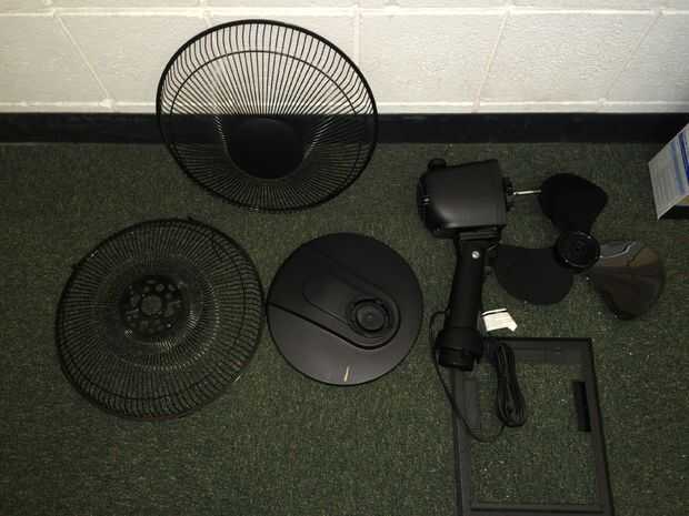 Una mesa o un ventilador de pie para un ventilador activado sonido es óptima porque el usuario debe colocar su cara cerca de las cuchillas para hablar en él. Elegí un simple ventilador de mesa $12. Oscila pero no es necesario, de hecho, es mejor si no es así, porque debe permanecer aún para el usuario.