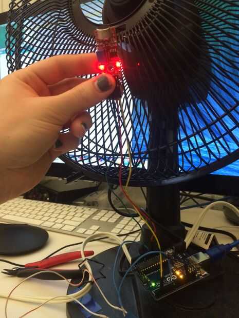 Ahora que el sensor está en el lugar, sus puentes que conectan con el arduino (que se coloca en la parte inferior del ventilador) no son lo suficientemente largos para llegar a ella. Así que si no usas puentes por lo menos 10 pulgadas o más, usted debe hacer lo que hice, que era simplemente alambre de la soldadura más para alargar los puentes.