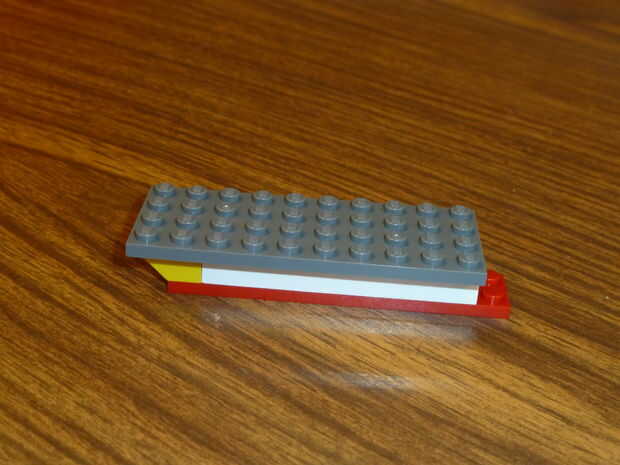 Ubicar el bloque de plano 4 x 10 (gris) y coloque encima los bloques blancos y amarillos. Asegúrese de que se centra en los bloques blancos y amarillos.