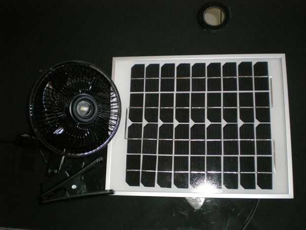 2. 10 vatios panel solar o panel con salida apropiada para ventiladores múltiples si lo desea. Los fanáticos deben ejecutar en electricidad DC. Se puede utilizar un ventilador que se enchufa en la pared. Tengo tres ventiladores conectados a un panel solar hecho en casa que produce alrededor de 50-60 w.