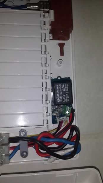 11. conectar el cable vivo (uno que lleva el voltaje) al contacto del relevador marcado COM común. Este cable está marcado generalmente negro (para recordar más fácilmente, negro significa muerte - igual si lo tocas).