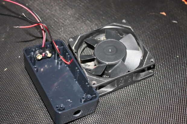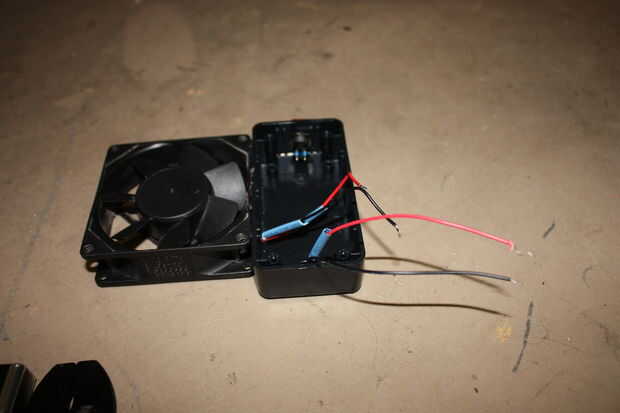 El segundo paso en el proyecto es para preparar el cable para soldar. La primera parte en este paso es sacar los cables del ventilador en la caja del proyecto. Desde aquí usted necesita hacer tres pequeñas porciones de contracción de la tubería, el cable negativo y para cada contacto en el botón. Ayuda para soldar puede retorcer los dos negativos juntos y tuerza el alambre positivo dos en los contactos.