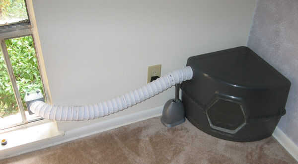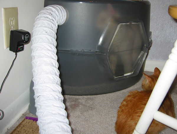 Por esa razón, hice esta sencilla caja de escape, que dibuja una pequeña cantidad de aire fuera de una caja de litera cubierta y sopla fuera. El ventilador de la computadora atrae suficiente aire para evitar olores de escapar de la caja. La pérdida de aire frío y caliente al exterior parecía ser bastante mínimo, porque no hay ningún cambio notable en los costos de calefacción y refrigeración. Funciona tan bien que la gente se sorprendería que había gatos en el apartamento.