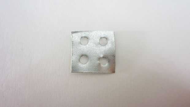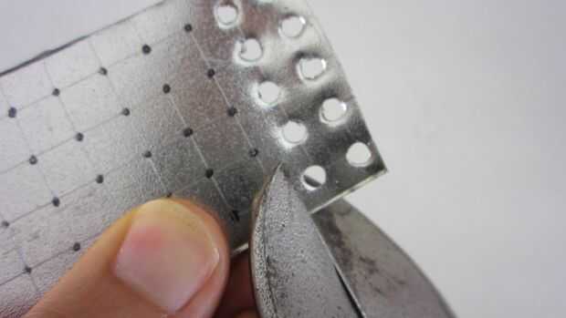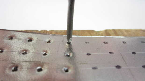 Luego use un clavo para perforar un pequeño agujero en los puntos donde se cruzan las líneas de cuadrícula. Luego perfore estos agujeros con una broca que es ligeramente más grande que los tornillos de la máquina que está utilizando. Al taladrar, asegúrese de que la placa se mantiene firmemente en su lugar. Si coge en la broca, puede girar alrededor realmente rápido y darle un corte desagradable. También recomiendo usar guantes. Después de taladrar los orificios, puede que desee utilizar un archivo o alicates para quitar cualquier afiladas rebabas en la parte posterior.