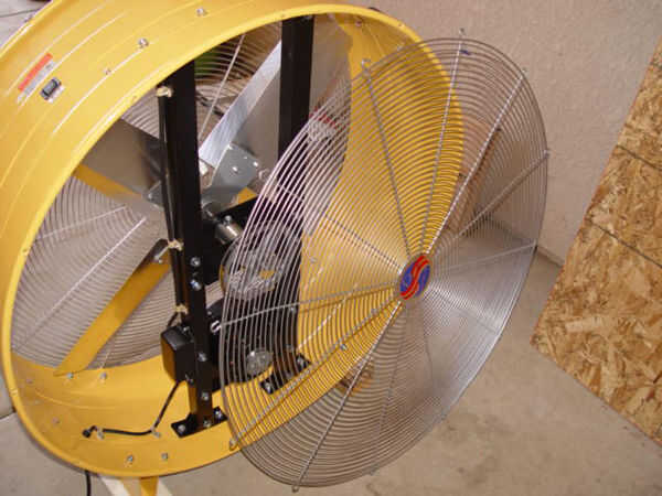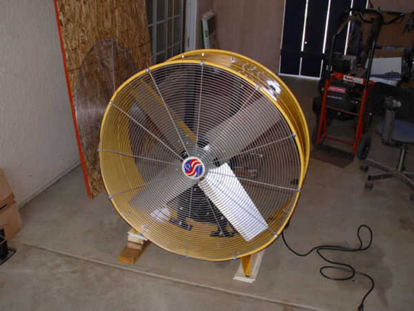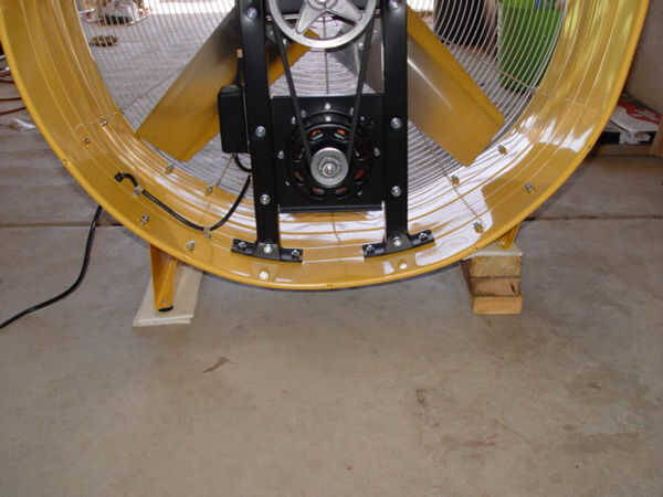 Para montar este ventilador vertical y elaborar el aire fuera de la casa un gran pleno debe construirse. Esto puede ser construido de chapa o madera contrachapada. Nuestro ventilador usamos dos de 4 x 8 hojas de 7/16" USB madera contrachapada. El primer paso en la construcción de la cámara es eliminar las ruedas, manijas o protectores de ventilador que podrían conectarse el ventilador de tambor. Luego Nivele el ventilador sobre una superficie plana, nivelada. Tenga en cuenta que la pila de 2 x 4 se usa para obtener el soporte de montaje del ventilador en posición vertical. Tenga en cuenta también la espuma de célula cerrada debajo de cada pie del ventilador. La espuma se utiliza para ayudar a reducir la vibración y la transferencia de ruido y debe estar en lugar durante mock up y montaje final para asegurar la apertura del pleno estará a la altura adecuada.