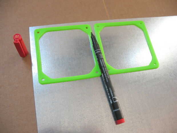 Con los amortiguadores como plantilla, marque la posición de los tornillos del ventilador de la hoja de acero. Deje aproximadamente 1/4" pulgadas entre. Taladre los orificios. Esto te dará dos plazas.