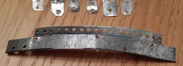 Mida la distancia entre los agujeros de dos ventiladores adyacentes. Marque la chapa con la distancia. Descubrí que una rejilla de metal de chatarra que cuando diagonal era la distancia correcta. Tomar un clavo o un punzón y martillo para hacer una sangría en el metal donde el agujero debe estar. La ayuda del guión la broca se desplace. Perfore los orificios y utilizar las tijeras para cortar la chapa en los soportes pequeños.