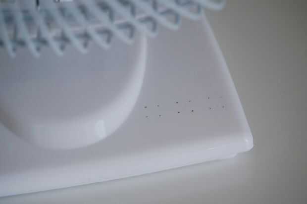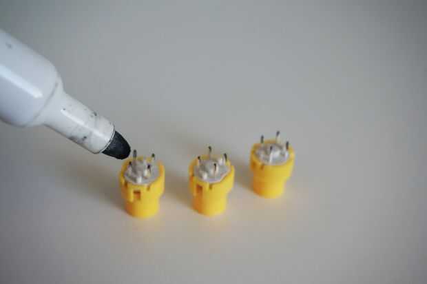 Montaremos los botones y el LightBlue Bean al pie del ventilador. Para abrochar los botones, utilice un marcador de pizarra para poner color en los pasadores de los botones y luego presionan contra el pie del ventilador para obtener pequeñas marcas de perforación.