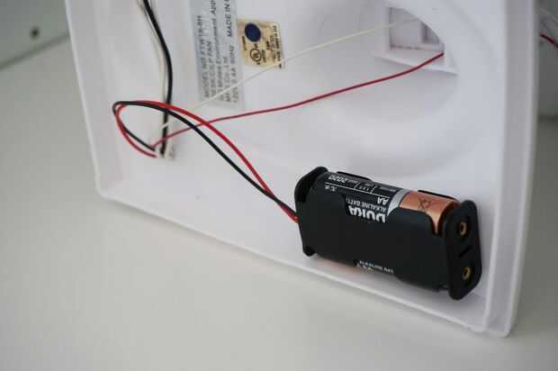 Tome el soporte de la batería y cinta adhesiva bajo el ventilador de pie. Tire de los dos cables de soporte de la batería a través del mismo agujero como los cables del botón. Un rojo a BAT en el grano de la soldadura pero deja negra. Tenemos que conecte un cable desde la cola del interruptor de potencia al mismo pin de GND por lo que esperaremos hasta que nos hemos fijado los cables.