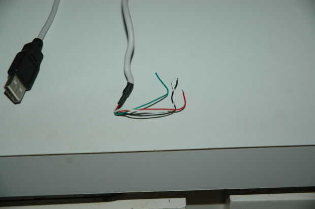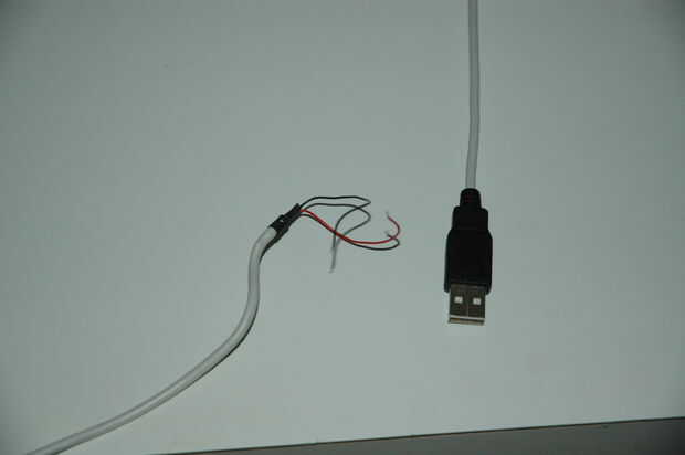 terminé usando un cable USB diferente de uno en la primera foto porque es probablemente mucho más como la que se va a utilizar. Corte el cable y el aislamiento externo. Debe haber cuatro o cinco hilos. Un cable rojo, cable verde uno, un cable blanco y uno o dos cables negros. Quieres uno rojo y un cable negro; Usted puede cortar el resto. Si tienes dos cables negros, tampoco se va a trabajar. Pele los extremos de estos dos cables con un cuchillo o un par de peladores de alambre.