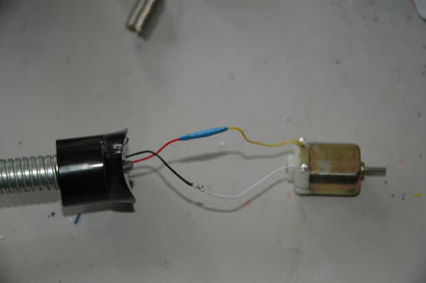 Para mi caso, he utilizado una lámpara rota, pero puede ser cualquier cosa que desee. Algunas otras ideas son un caso de ventilador portátil, un ratón de ordenador, o incluso una caja de madera con algunos agujeros perforados en él. Para mí, "preparando el caso" significaba desenroscar la bombilla, cortando el enchufe, quitando la parte superior de la caja y sacar los cables. Entonces, rosca mi cable USB a través del "tubo". Esto era de lejos la parte más difícil y tuvo mucha paciencia. Conecte el motor con cinta y enchúfelo para asegurarse de que el ventilador que funciona correctamente.