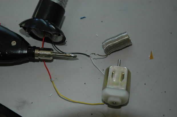 En primer lugar, usted necesita averiguar de que manera desea que el motor gire. Poner temporalmente en las aspas del ventilador y mantenga los cables juntos con los dedos o con alguna cinta. Si el ventilador sopla el aire hacia atrás, cambie los cables (para mí, era rojo en amarillo, negro sobre blanco). La soldadura de los cables y quitar las cuchillas.