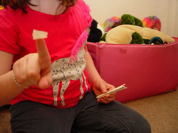 Ahora se unen los extremos interiores de los dos palos.  Mi hija se unió a ellos con la cinta.  Utilizo un trozo de tela con un pegamento de buena calidad.