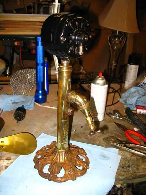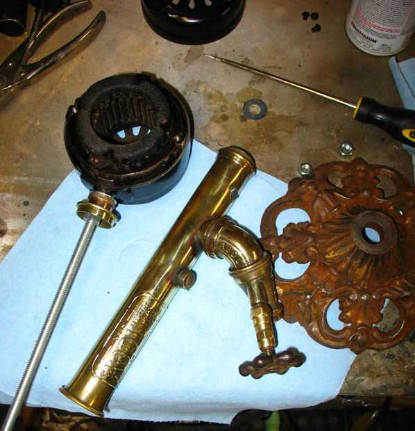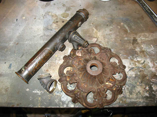 Corté una sección del rociador latón que planeaba usar como cuello del ventilador y limpió la lámpara de hierro fundido planeaba usar base. Pulido las piezas de latón con una rueda que pulimenta de banco montado, pero puedes usar brasso u otro Polaco - sólo tarda más.